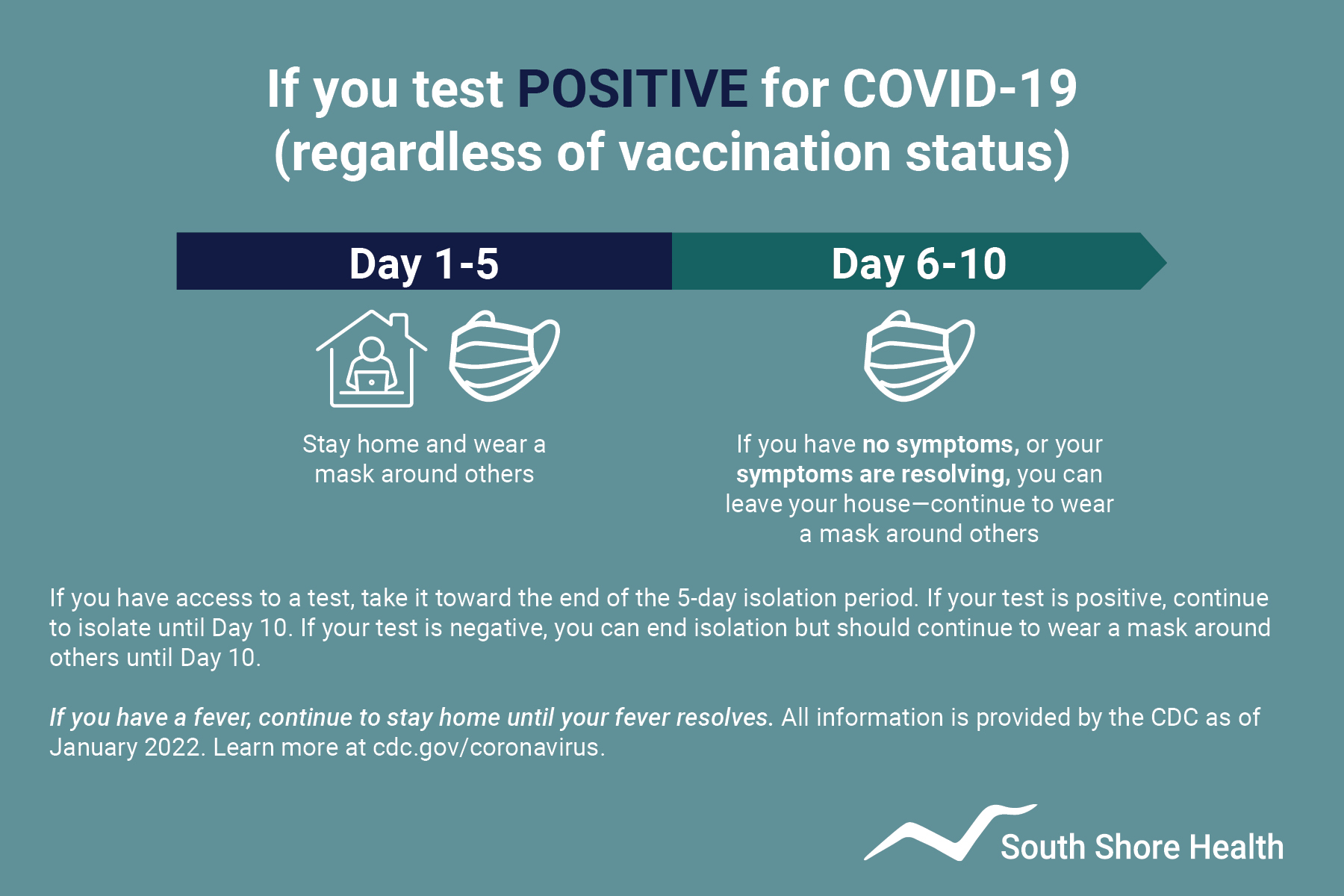 If you have access to a test, take it on day 5. If your test is positive, continue to isolate until day 10. If your test is negative, you can end isolation but should continue to wear a mask around others until day 10.