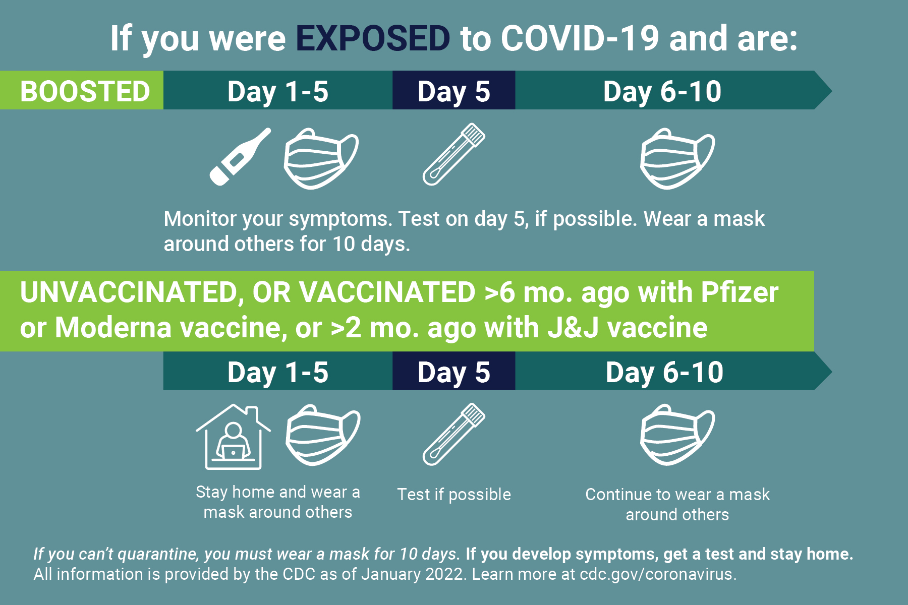- Unvaccinated individuals or individuals who haven’t received a booster: Quarantine for five days. Get a COVID-19 test, ideally 5-7 days after exposure. Follow that five-day quarantine with strict mask use for an additional five days.